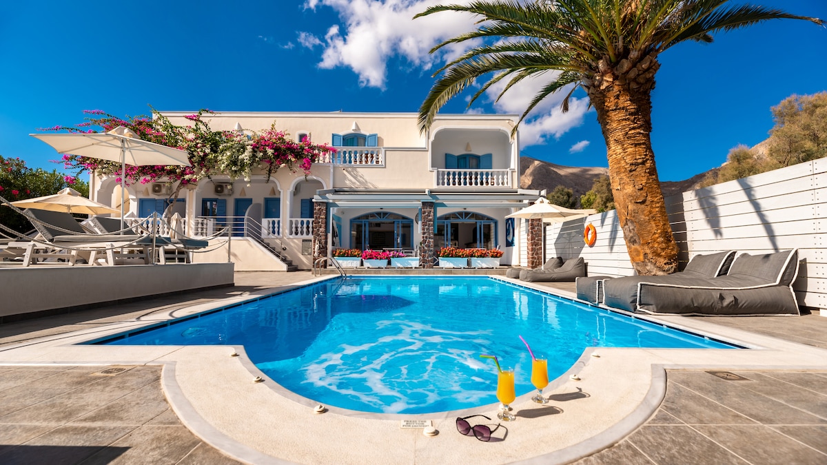 In beautiful Cyclades islands, in enchanting Santorini, the island of dreams and love, and in Firostefani area, one finds Ersi Villas with modern facilities for pleasurable vacations. Ersi Villas offers quaint accommodation on the island of Santorini Greece and is a full service hotel in the tranquil area of Firostefani , just a few steps away from the centre of Fira. In the chic pool area of Ersi villas you will revel in the sunlight, lounging and relaxing in lush sunbeds !