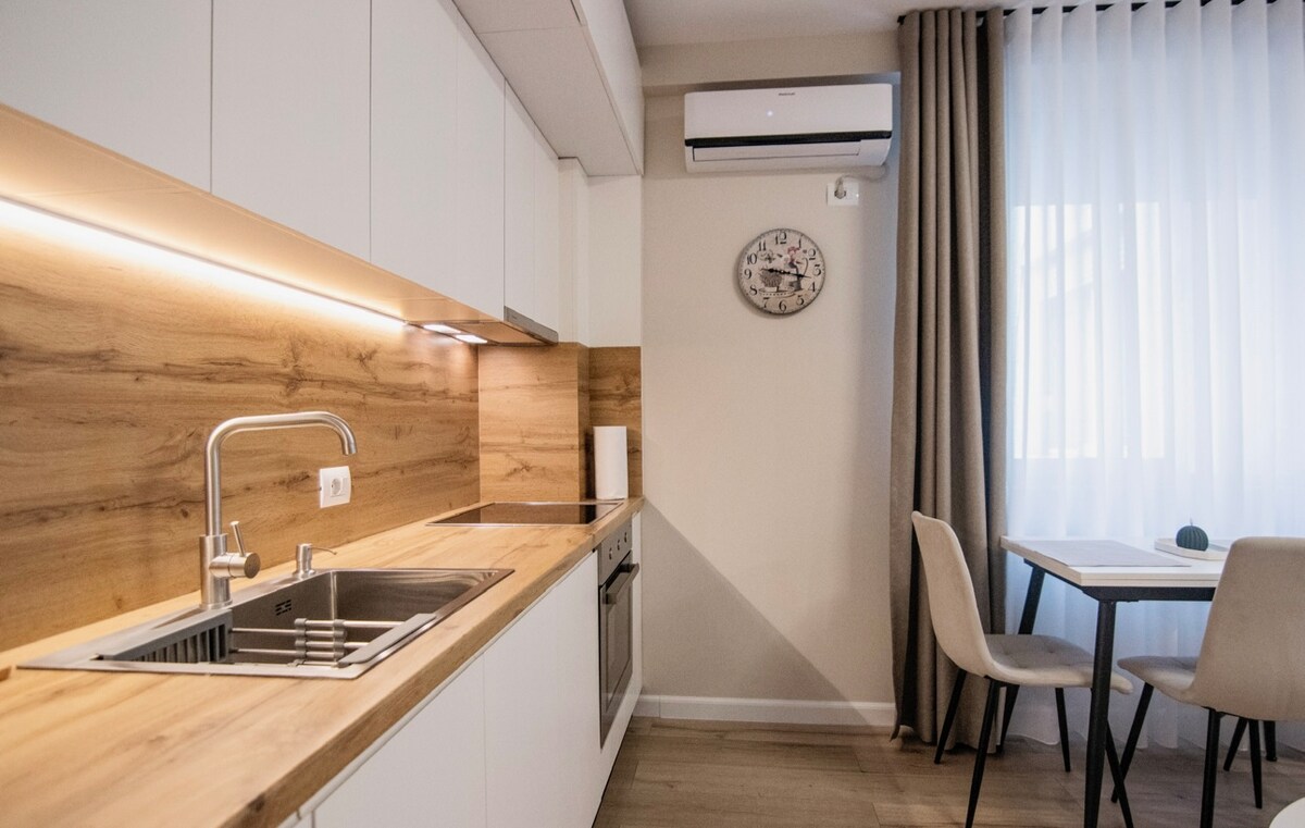 Наша квартира розташована в 900 м (пішки) від центру Тирани. Він розташований в одному з найспокійніших районів Тирани. Квартира знаходиться на 7 поверсі, де можна скористатися ліфтом. Усе в квартирі нове, починаючи від підлоги до стелі. Кухня повністю обладнана. Балкон дуже просторий, і з нього відкривається найдивовижніший вид на захід сонця.