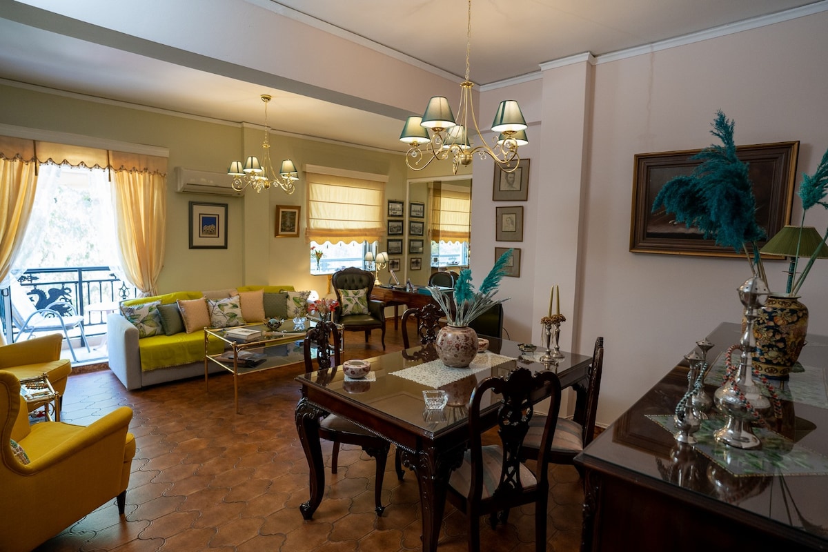Квартира( на другому поверсі) розташована в центрі Піреуса, до неї можна дістатися на громадському транспорті, біля ринку з твердим покриттям, де можна знайти всілякі магазини, ресторани та кафе або прогулятися по морю. Він також знаходиться неподалік від порту Пірей і з 'єднаний з аеропортом. Він ідеально підходить для відвідування Афін або щоденних екскурсій на острови. Апартаменти просторі та яскраві, повністю відремонтовані, з високими стелями та підлогами з чорного мармуру, любляче декоровані.