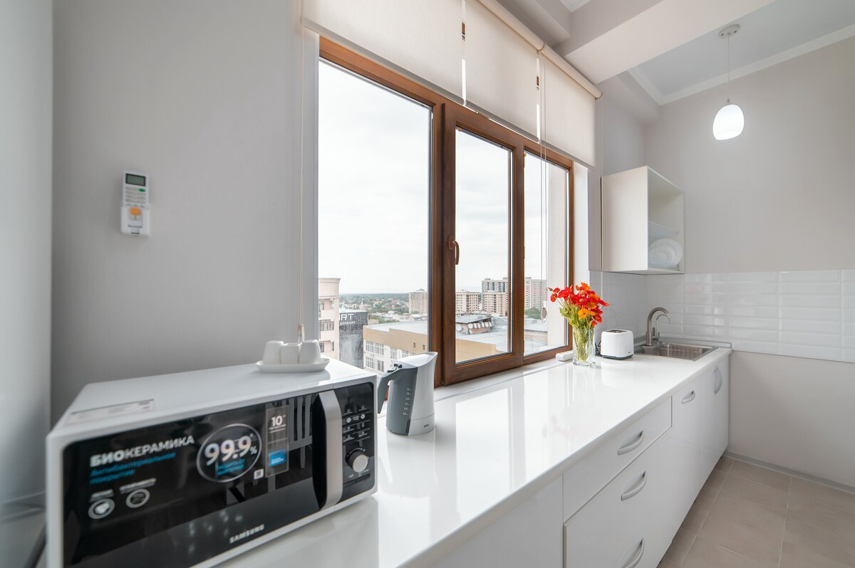 Новий сучасний пентхаус на 12 поверсі нової будівлі (2 ліфти) в центрі Бішкека. Повністю обладнане обладнання з усіма модифікаціями, 2 абсолютно новими кондиціонерами, кофемашиною Nespresso, повною кухнею, підлоговим опаленням, супершвидким Wi-Fi, стильним робочим столом та усім необхідним для роботи та відпочинку. Квартира має 2 балкони, і виходить на схід через північний захід. У сучасній спальні зі скляною стіною та бліндажами для конфіденційності є гардероб. Надзвичайно мирно, перебуваючи посеред усього.