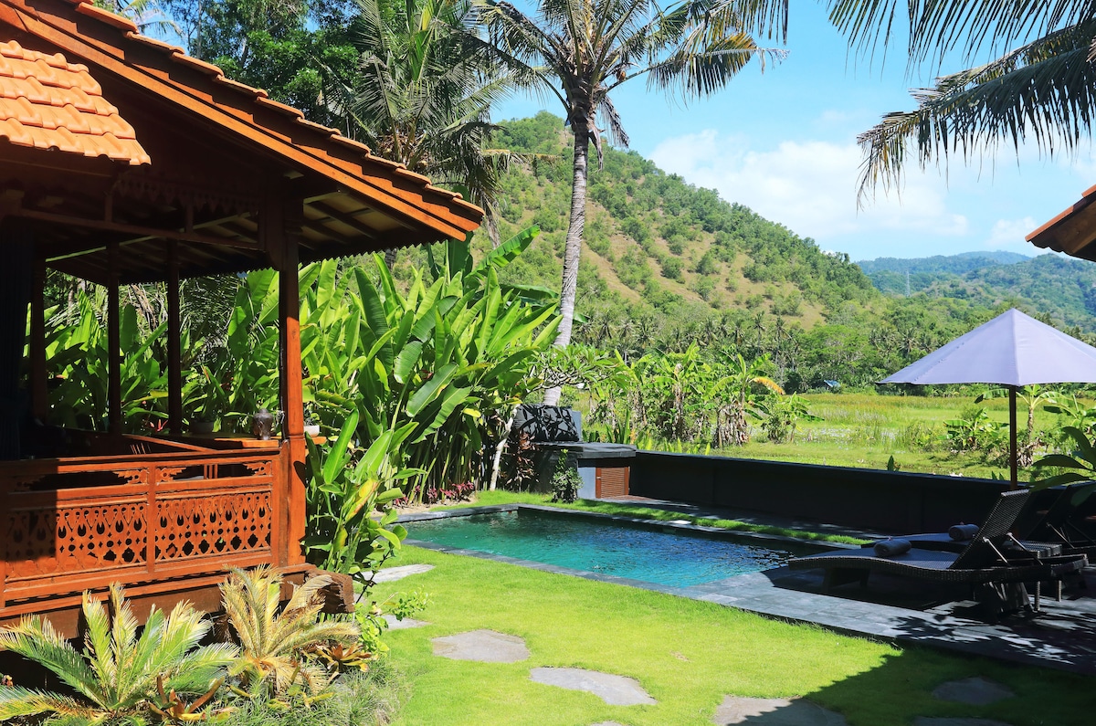 Це бунгало з 2 гостьовими будинками, басейном, фітнес-залом і великим садом розташоване в затишному районі рисових полів у невеликому селі Кулік, між горами та поблизу моря. Звідси відкривається чудовий вид на Гунунг Агунг. Невелика річка спереду і одна за будинком, оточена природою та кількома місцевими сусідами. Усе це разом робить це приватне помешкання ідеальним для любителів природи, любителів культури, медового місяця та мандрівників, які шукають місцеву атмосферу.