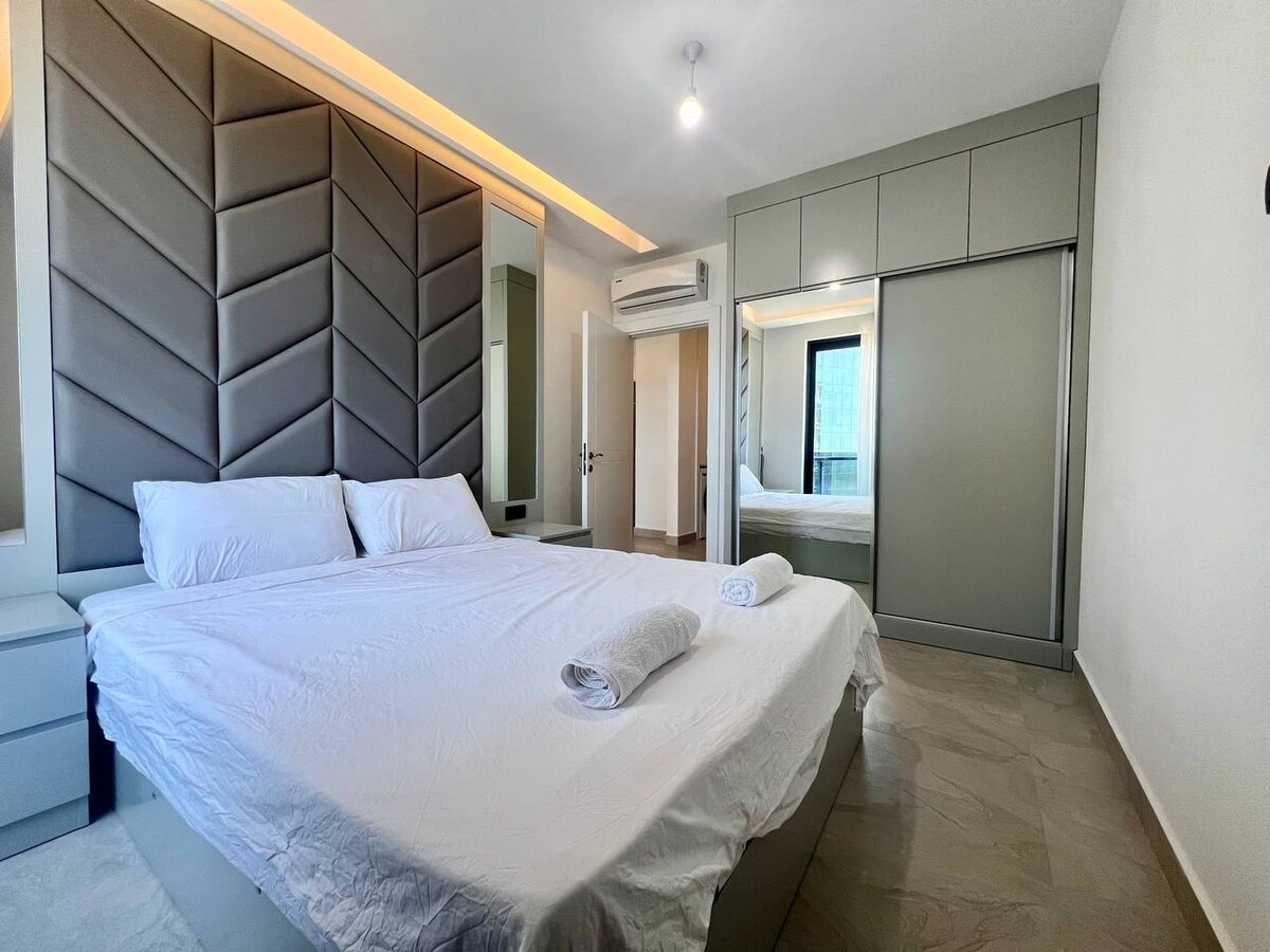 Шикарна квартира з панорамним видом на море та власним ландшафтним пляжем. Дуже світлий і теплий, у найкращому новому комплексі Yekta Kigdom Trade Center. У квартирі є 2 спальні та кухня-вітальня, в одній спальні є двоспальне ліжко на другому 2 односпальному ліжку, яке за необхідності можна об 'єднати в одне двоспальне ліжко, є 2 розкладні додаткові ліжка, у вітальні, розкладний 1,5 спального дивана.