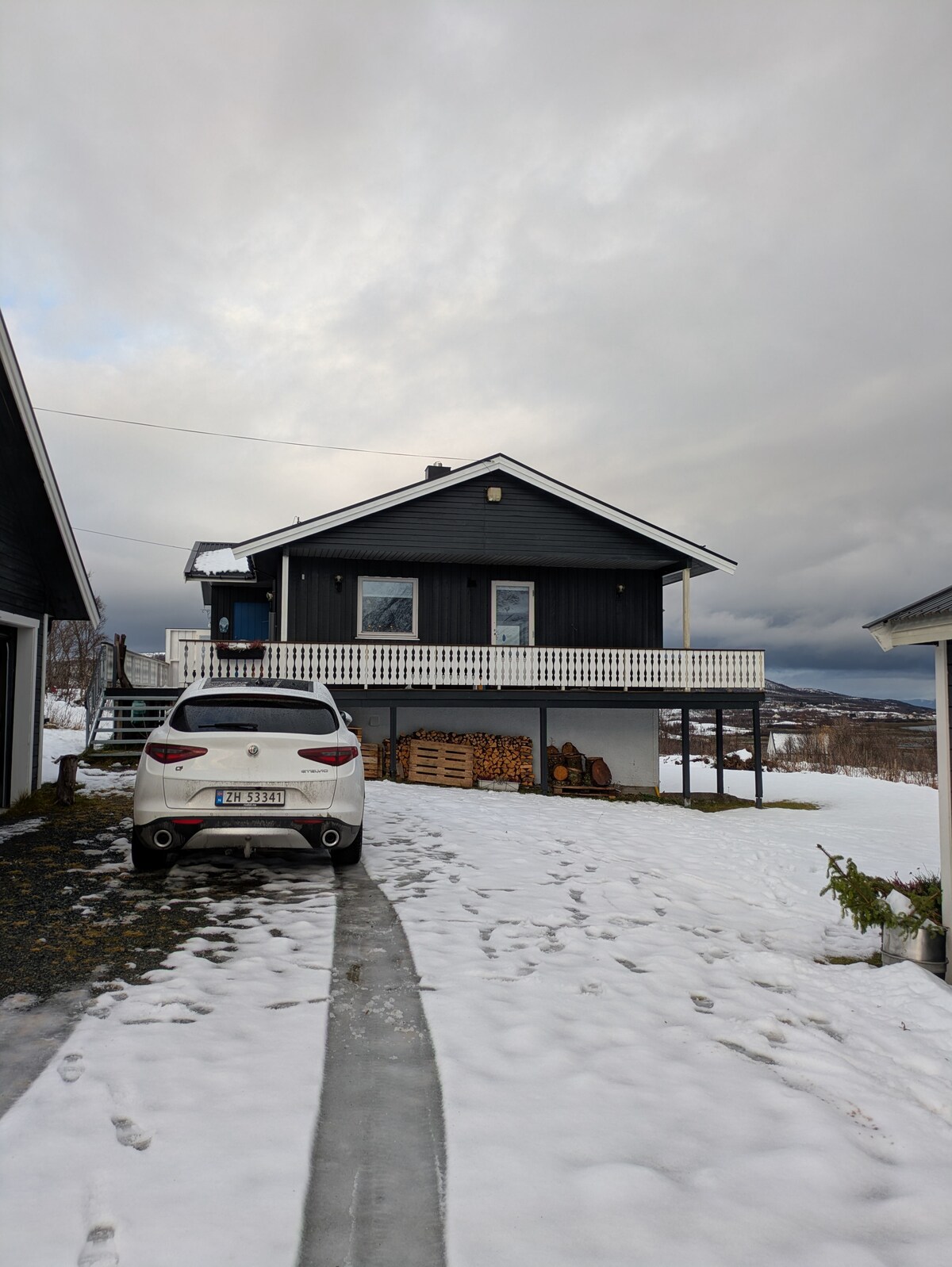 Koselig feriehus over 2 plan i rolige omgivelser, like ved Hansnes på Ringvassøy. 1 times biltur fra Tromsø by. Huset ligger på et lite tun med kjøreadkomst helt fram til døra. 2 soverom har dobbeltseng, 1 har enkeltseng, 1 har 150cm seng. Huset er 82m2 med bad, kjøkken, romslig stue og 4 soverom i 2. etasje. Grillhytte fullt utstyrt på 10m2 med plass til alle. WIFI via 4G nett kan benyttes inntil en viss maksgrense. Vedovn og 2 sekker ved for fritt bruk er inkludert.
