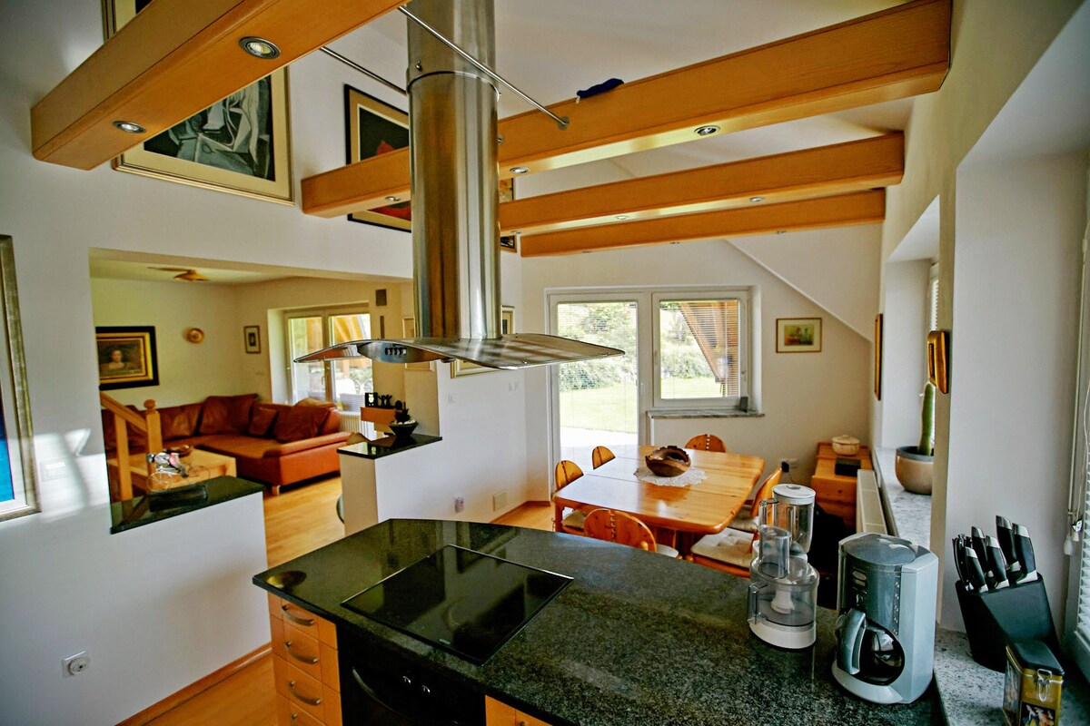 Квартира (50 м2) розташована на 1-му поверсі, має великий балкон з видовищним видом на походи та Шіберг Герлітцен. Є прогулянки по романтичних лісах, вздовж Драви, до озера Фаак (2 км) і озера Зільберзее (2 км). Затишна кухня, просторово відокремлена сходами від спальні/вітальні з ванною кімнатою, повністю обладнана, доступний швидкий Wi-Fi та безкоштовна парковка прямо перед будинком. Дуже тихе місце, також підходить для дітей.