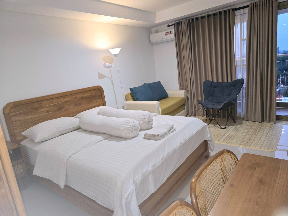 Welcome to our cozy OAOA studio apartment with a balcony to enjoy the city & mountain view! Located in strategic area only 5 mins walk to the famous Dago street, 10 - 15 mins walk to Sabuga jogging track and Bandung Zoo, ca. 35 mins to floating market Lembang by car. We accommodate up to 3 guests. We have a queen size bed 200x160 cm & a sofa bed 180x75cm, a bathroom with shower & water heater, kitchen set, and smart TV. Please read our terms and conditions before making a reservation.