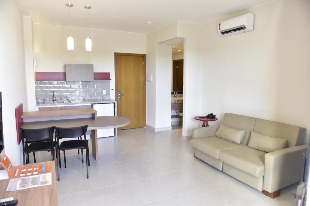 Готель перед озером Caldas Novas/GO, Eco Resort Lake Islands. Тут є аквапарк з басейнами з підігрівом, дитячі басейни, бар, ресторан, сауна, тренажерний зал, мультиспортивний корт, басейн, настільний теніс, обмінник тощо. Квартира з 1 спальнею з двоспальним ліжком, 1 ванною кімнатою, вітальнею з телевізором і двоспальним диваном-ліжком, 4-місним столом, плитою, міні-баром, мікрохвильовою піччю, посудом, склянками та столовими приборами (У НАС НЕМАЄ каструль і сковорідок, а також засобів для прибирання). Кімната та кімната з кондиціонером. Ми надаємо рушники та постільну білизну.