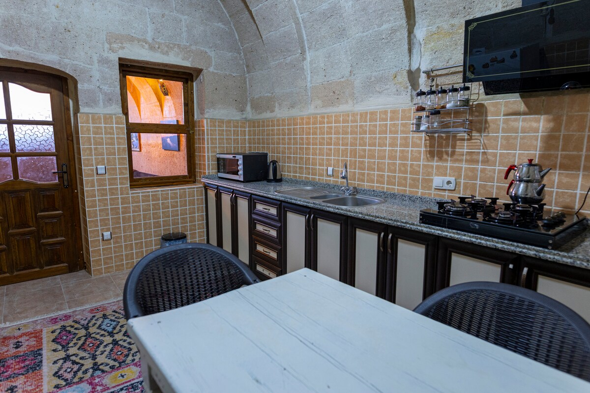 Натхненна любов 'ю до турецького стилю та простоти сучасного дизайну, наш верхній кам 'яна квартира світла та простора з балконом Джульєтти, спальня з ванною кімнатою розміру Queen size, простора вітальня з акцентами, а також розкладний диван і дуже зручне односпальне ліжко, ідеальне для відпочинку серед кілімських подушок. Нагорі повністю автономна кухня/їдальня, додатковий туалет і тераса, занедбана тераса. Ідеально підходить для вечері на відкритому повітрі та відпочинку в сільській атмосфері після насолоди Каппадокією.