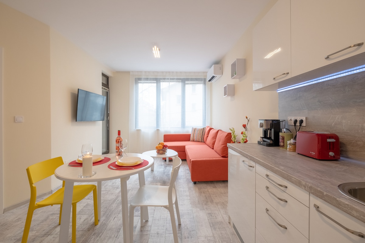 Ласкаво просимо до нашого бутикового сонячного люкса. Стильне помешкання з великим шармом і любов 'ю до найдрібніших деталей. Розташована в новій розкішній будівлі поруч із міським парком Гео Мілева, зручно розташованому між аеропортом і центром міста, це дуже тихе місце, яке підходить як для сімейних, так і для бізнес-мандрівників. Ми будемо раді, якщо ви станете нашим гостем, і допоможемо зробити ваше перебування незабутнім. Якщо ви хочете зробити покупки, пам 'ятайте, що торговий центр «Сердика» знаходиться неподалік.