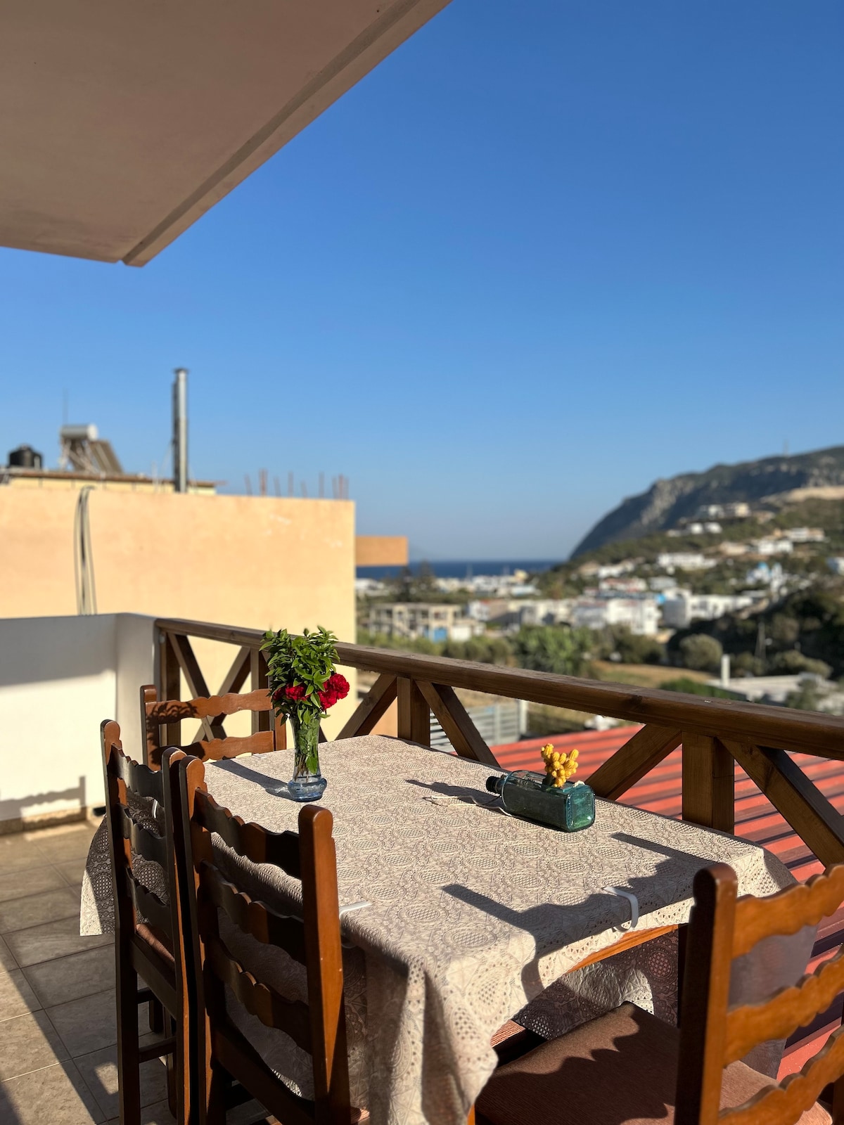 This is a beautiful brand new 50m2 studio apartment overlooking the kamari bay and Dikaios mountain of Kefalos village. The rooms are decorated with ethnic objects from my travels around the world. The apartment would be suitable for couples or single occupancy only. Unfortunately no kids or pets are allowed.