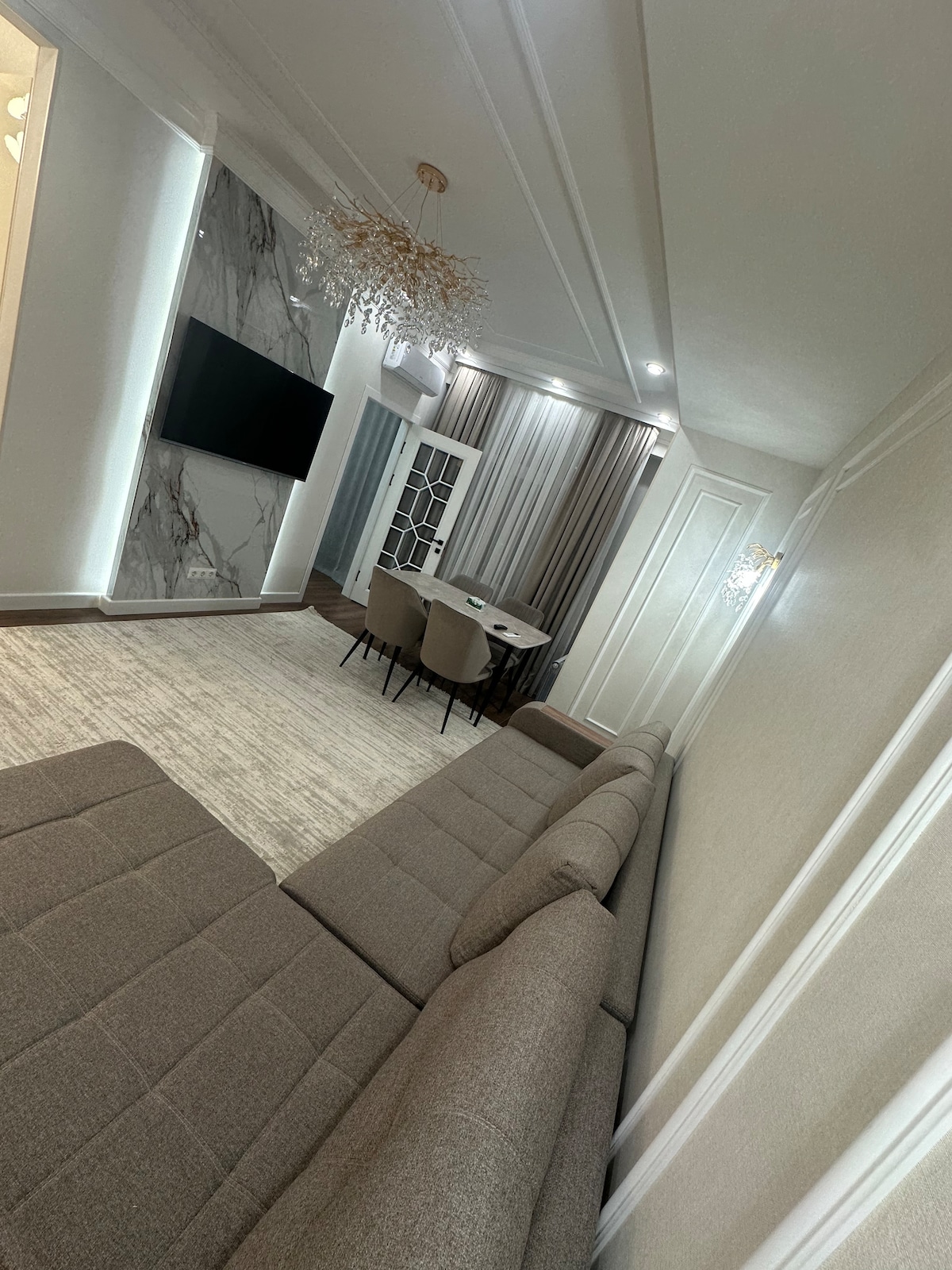 Cozy, Luxury Apartment for a comfortable stay in the freshly made Elite House located in the city center. The house is striking both day and night. At night, the building shines very beautifully, can be seen even from a long distance. On the ground floor of the building, there is a 24/7 supermarket & pharmacy, GYM, beauty salons, bank. The apartment is very bright and comfortable with all amenities. The building is safe and guarded around the clock, there is also a playground on the territory.