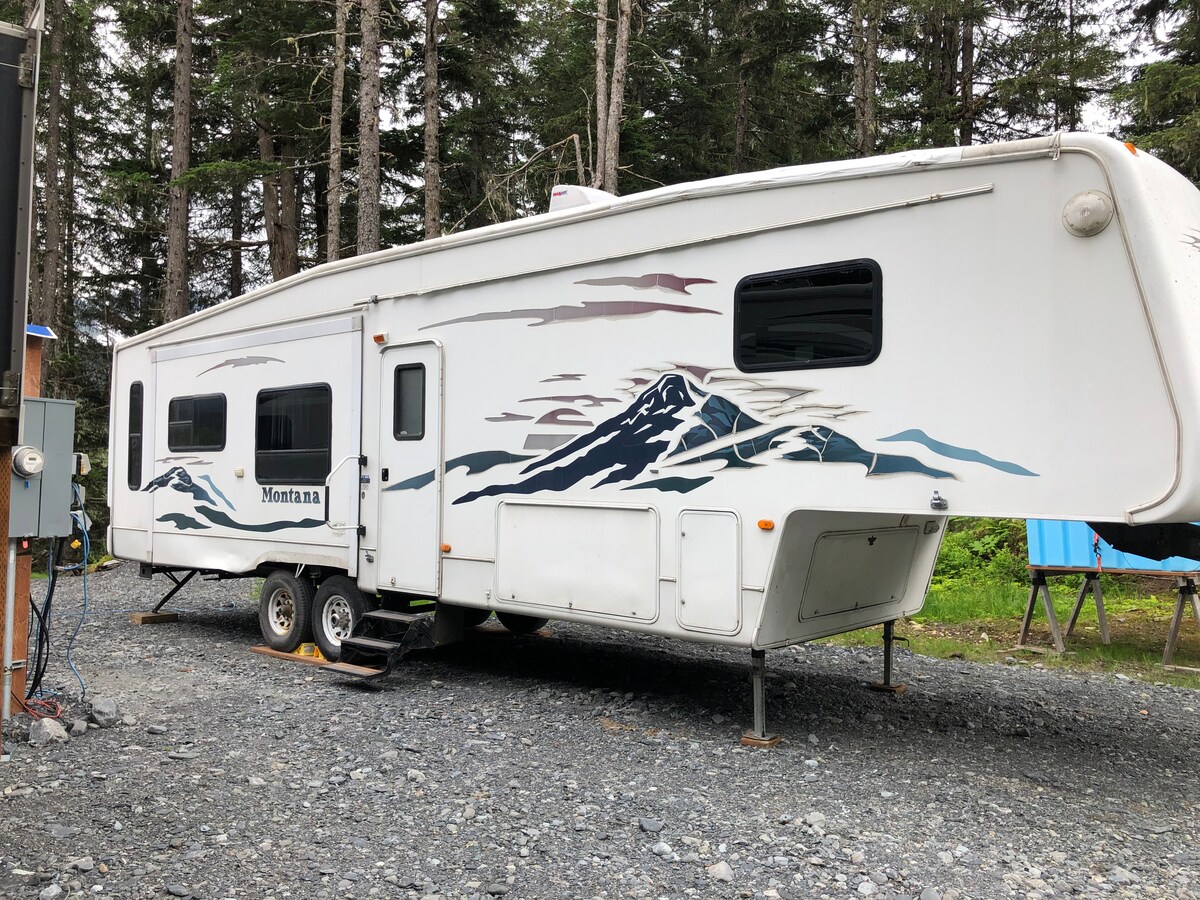 Просторий 32-футовий автобудинок класу C облаштований і готовий стати вашим базовим табором для ваших пригод. Розташоване в центрі півострова Кенай. У вас достатньо місця для сну з ліжком queen-size у зрубі, ліжком queen-size+ над таксі та столом, який також розкладається на ліжко. Баня на території також включена до вашого перебування з пральнею, повнорозмірною ванною кімнатою та душем. Насолоджуйтеся природою з каміном, столиками для пікніка та грилем для барбекю.