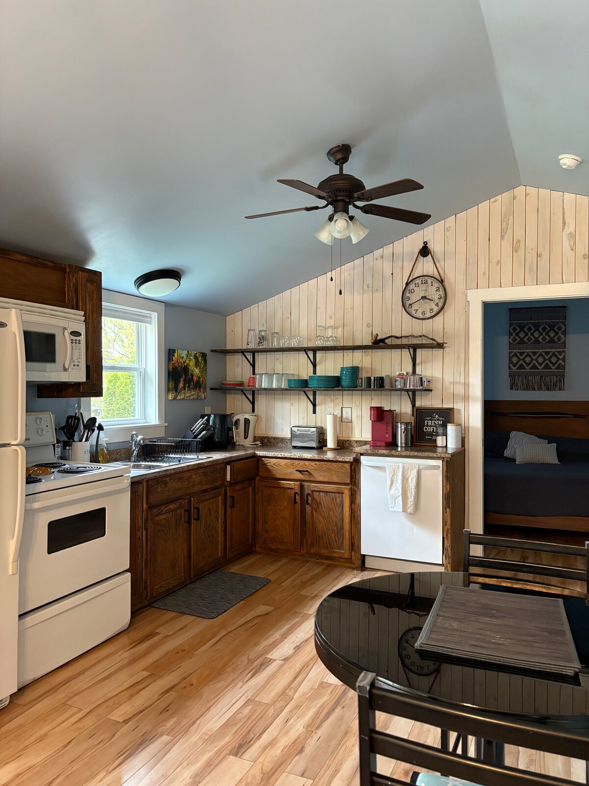 Сучасна, новозбудована квартира в фантастичному місці, що знаходиться в декількох хвилинах ходьби від усього у Вулфвіллі. Квартира з 1 спальнею складається з ліжка розміру «queen size», повної кухні та ванної кімнати, місця для 4 осіб у вітальні, обіднього столу, барних сидінь та невеликого зовнішнього патіо. Квартира повністю відокремлена від нашого будинку і над гаражем. На території є телевізор Smart TV і Wi-Fi, а також кондиціонер і парковка для одного автомобіля. Це квартира без домашніх тварин і диму.