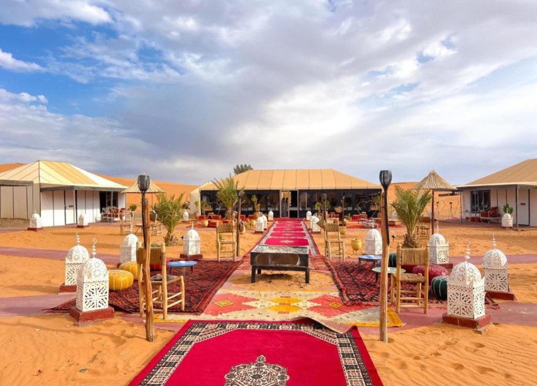 Soy Daoud, del equipo del Campamento de Lujo en el desierto de Merzouga. Nuestro campamento está ubicado en medio de las dunas doradas del Sahara, lejos del ruido y rodeado de naturaleza y tranquilidad. Ofrecemos una experiencia auténtica y confortable en el corazón del desierto, con hospitalidad bereber y un ambiente mágico bajo las estrellas.