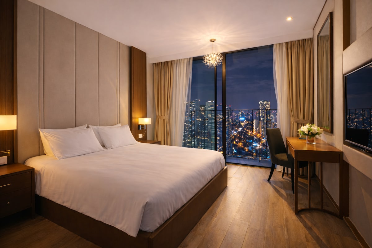 Ця стильна студія на високому поверсі в Panorama Nha Trang пропонує ідеальне поєднання комфорту та сучасних зручностей. Вікна від підлоги до стелі відкривають чудовий вид на місто прямо з вашого ліжка розміру king-size з преміальною 5-зірковою постільною білизною. Просторе помешкання з широким робочим столом, 43-дюймовим телевізором Smart TV і великою, добре обладнаною ванною кімнатою. Незалежно від того, чи ви тут у справах, чи на відпочинку, ви насолоджуватиметеся спокійним відпочинком у центрі Нячанга, всього за кілька кроків від пляжу, ресторанів та розваг.