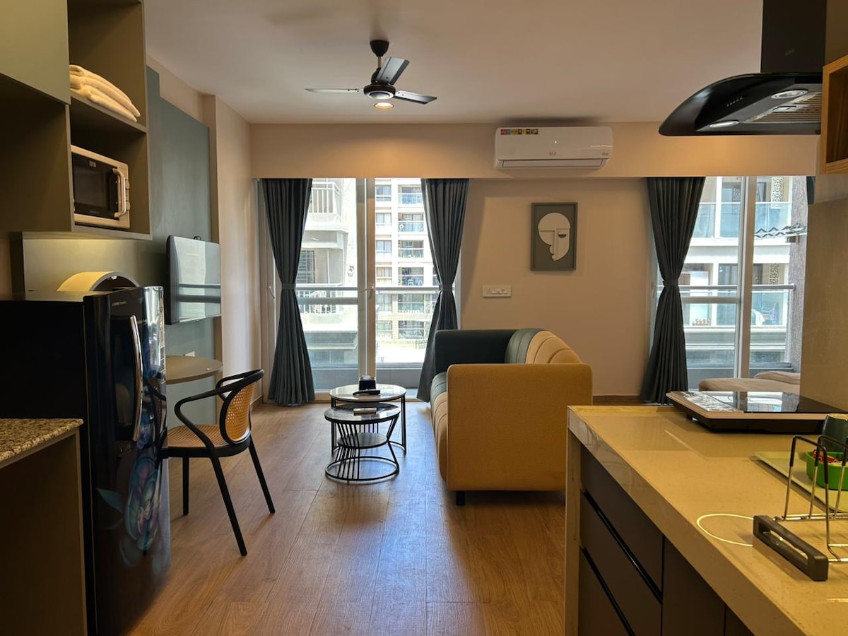 Ласкаво просимо до нашої стильної, затишної квартири 1 BHK, розташованої в 15 хвилинах їзди від аеропорту Пуни. Насолоджуйтеся спокоєм цього сучасного помешкання, обладнаного кондиціонером для комфорту. Платна трансляція з Wi-Fi до 100 Мбіт/с і зручно отримуйте продукти в нашому власному супермаркеті. Насолоджуйтеся безкоштовним чаєм і кавою, відпочиваючи на преміальних матрацах, одягнених у якісну постільну білизну. Ми забезпечили вас наданим шампунем і гелем для тіла для безтурботного перебування. Відчуйте комфорт і зручність у найкращому вигляді!