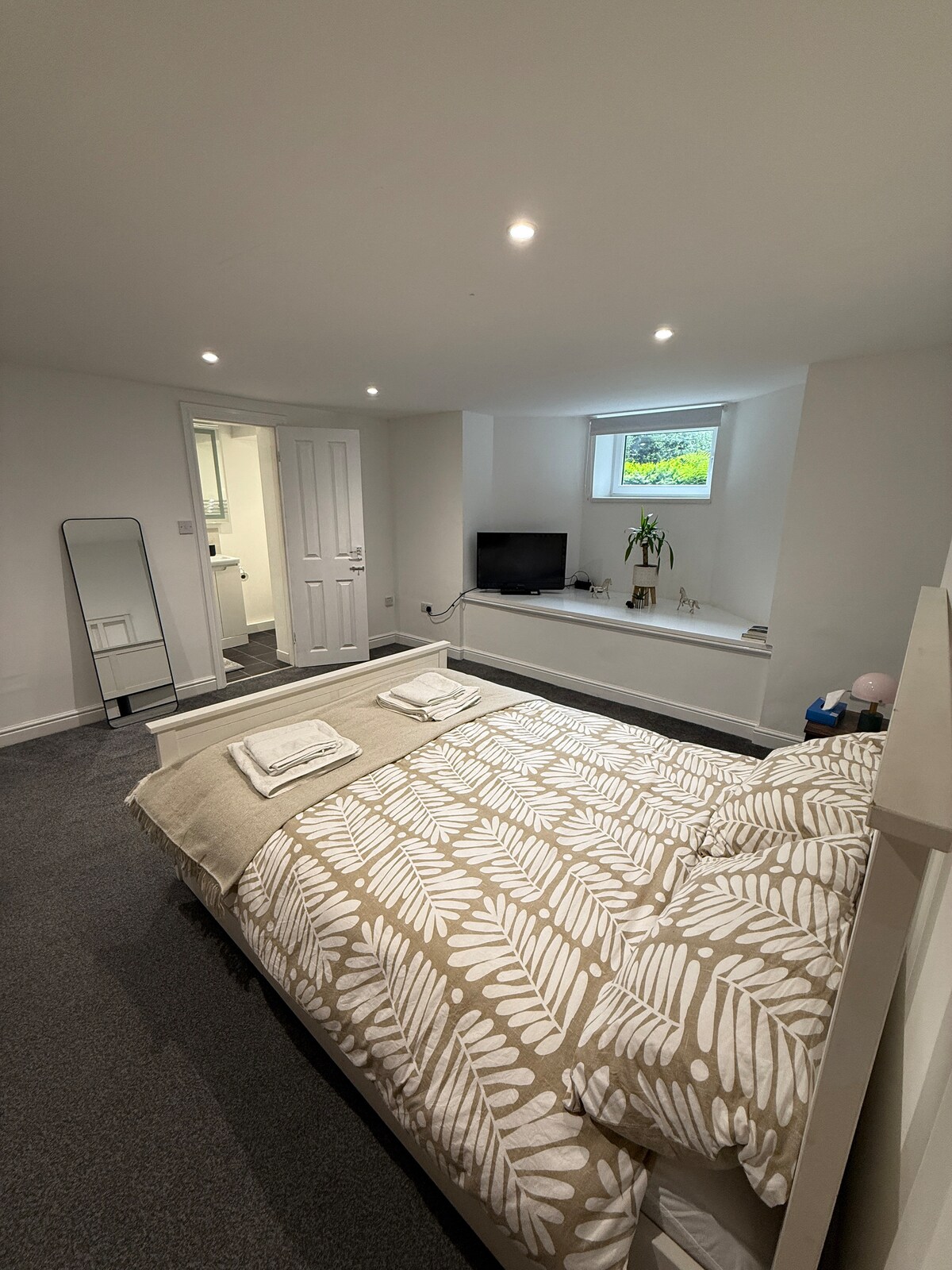 Чудова нещодавно завершена простора автономна квартира-студія на цокольному поверсі/саду з природним освітленням. Власний сад у сільській місцевості. Надаються шезлонги. На кухні є мікрохвильова піч, холодильник, тостер і раковина. 40-дюймовий телевізор зі Sky TV/Amazon Prime та Netflix. Двоспальне ліжко та диван. Окрема душова кімната з туалетом, душем та раковиною. Поруч з аеропортом Лідс/Бредфорд та Трініті-коледжем. Зверніть увагу, що до цієї підвальної квартири можна дістатися через 12 сходинок, і вона може не підходити для гостей з обмеженими можливостями пересування