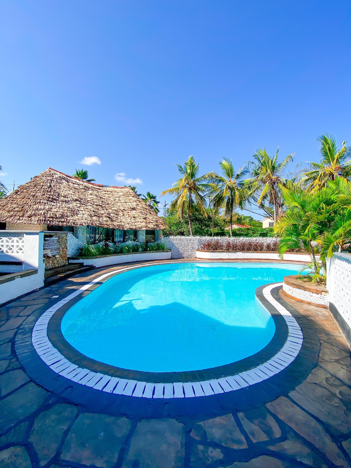 Bring the whole family to this great place with lots of room for fun. Welcome to your ultimate holiday destination in the leafy suburbs of Nyali Mombasa in a 2 bedroom villa all en-suite with a swimming pool, walking distance to the beach, close to malls and entertainment areas. Amenities include; *swimming pool *Free parking *Ample security *Hot showers *bbq grill *Free WiFi *smart tv and many other amenities. Great for families and group trips. Welcome to book your stay with me