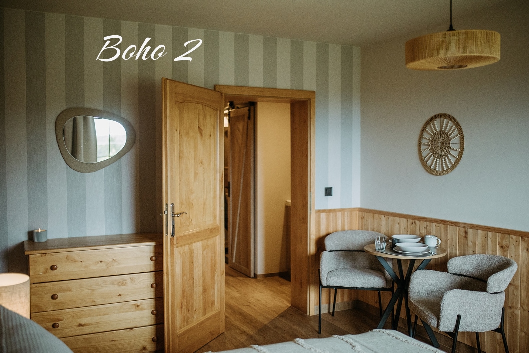 Велике шале з 2 спальнями + ніша з 2 ванними кімнатами та туалетом, велика вітальня з каміном, обладнана кухня, сауна та душова зона. На вулиці є захищене патіо, парковка, дитячий майданчик та барбекю, а також дерев 'яна тераса з джакузі, лаунж-зоною та шезлонгами. Дитяче ліжко (60x120) за запитом за 250 крон/ніч Дозволено перебування з невеликими домашніми тваринами, за винятком номерів із доплатою 2000 крон за перебування + депозит 5000 крон (оплачується на місці)