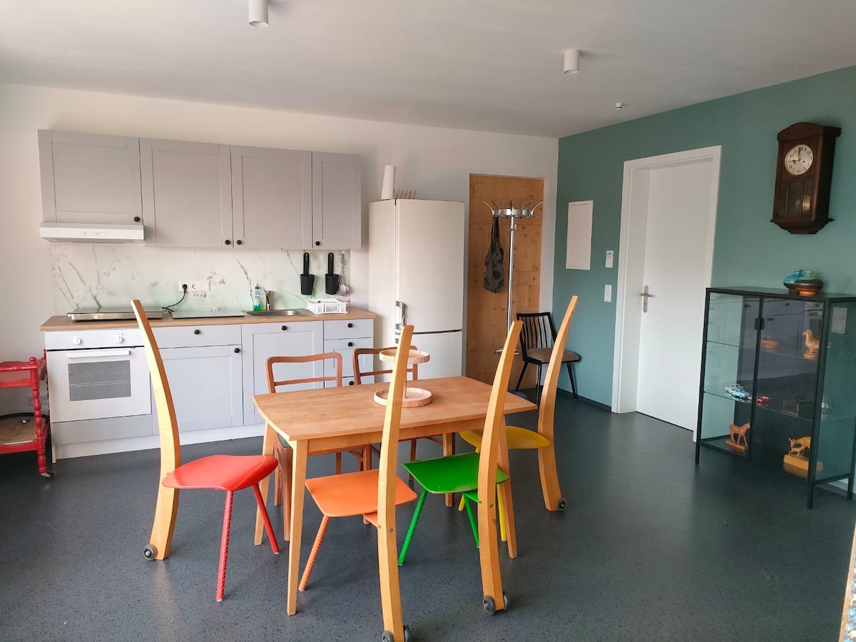 Ця комфортабельна квартира площею 108 кв. м на першому поверсі (без бар’єрів) розташована в чарівному селі на околиці міста, звідки легко дістатися до міста Фульда в стилі бароко та сусіднього регіону Рон. Окрім двох спалень і дитячої кімнати, у квартирі є дві ванні кімнати. Простора вітальня, обладнана 55-дюймовим смарт-телевізором, обідньою зоною відкритого планування та повністю обладнаною кухнею, обов’язково вразить вас. Затишна атмосфера дров’яної печі та ванни запрошують вас розслабитися та відпочити.