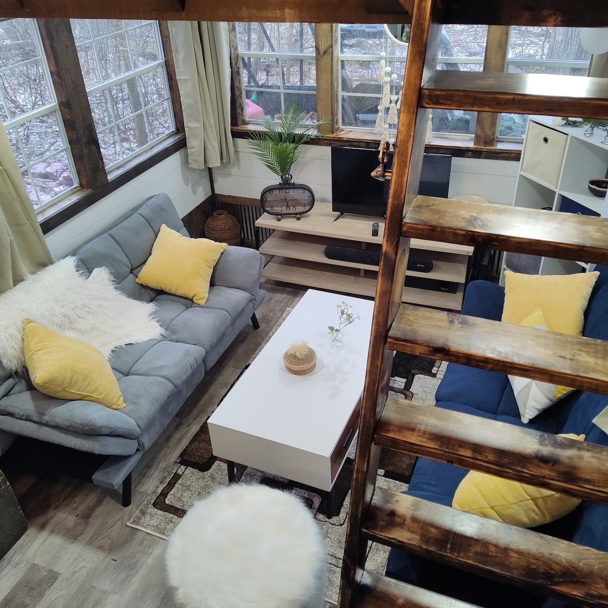 Guests love the peace, privacy and nature. Tiny home (1 of 5 spaces on 8 gorgeous acres) with a lofted full-size bed and full-size private bedroom in the lower level. fully stocked kitchen with electric plate, refrigerator and all utensils, organic soaps and air conditioning! Fire pit with Adirondacks and grill and plenty of wood, propane and Edison lights. Private use bathhouse with shower (open april 15-oct 7) and year round camping toilet.