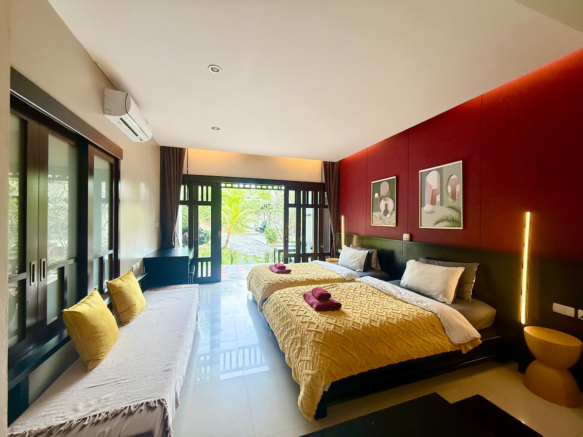 Подвійний розмір середньої вілли! Високі стелі, відкритий план, величезний басейн із сіллю та величезні внутрішні/зовнішні житлові приміщення, 3 ліжка розміру King size та диван-ліжко. Центральне розташування на безпечній рівній бетонній дорозі з швидким і легким доступом до всіх куточків острова. Абсолютно нова будівля з кухнею європейської якості та меблями, включаючи фільтровану питну воду. 2 житлові зони з великими телевізорами та окремими входами. Повна безпека та усамітнення з бамбуковою огорожею довжиною 3 м, оточеним кокосовими пальмами та тропічним садом.