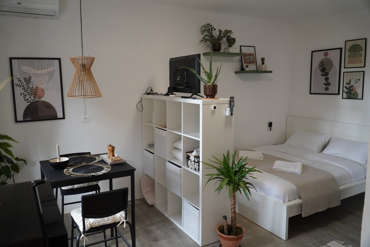 Студія з кухнею, приватною терасою, великим двоспальним ліжком. Поруч є громадський паркінг. Поруч зі зручностями, зокрема піцерією, продуктовим магазином, пекарнею та заправкою, щоб ваше перебування було безтурботним.