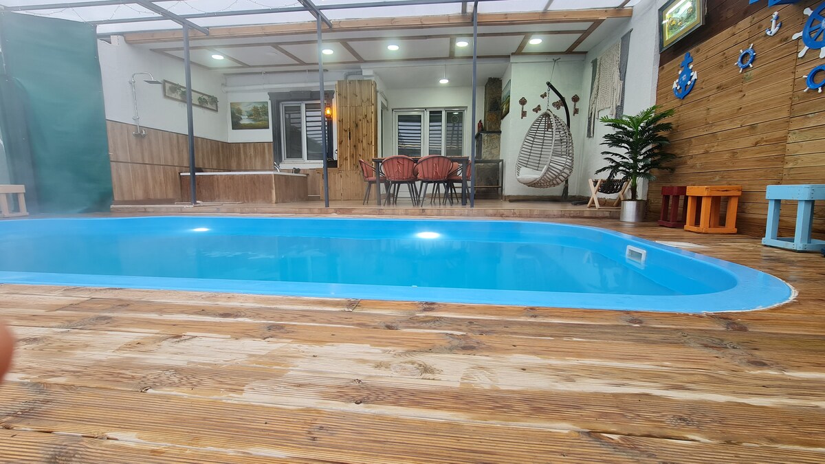 Ми чекаємо на вас поруч із лісом у нашому помешканні з 5 кімнатами, ванною кімнатою, туалетом, джакузі, басейном із теплою водою, зимовим садом і каміном. Басейн з підігрівом доступний протягом зимового сезону. За перебування понад 10 осіб стягується 2500 лір з особи. Деревина за додаткову плату