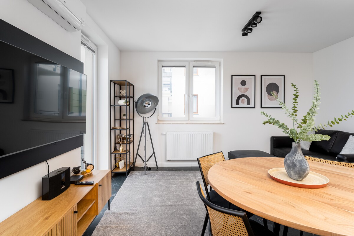 Відкрийте для себе справжню перлину міста. Сучасний урбаністичний дизайн, розташований у новій будівлі. Переваги: * Зручне самостійне прибуття. * Окрема спальна зона з ліжком розміру Queen size, а також розкладним диваном. * Кондиціонер, верхня пральна машина з режимом сушильної машини. * Окреме робоче місце, оптоволоконний Інтернет. * Повне кухонне обладнання. * 20 хвилин їзди на Uber від Вавельського замку.