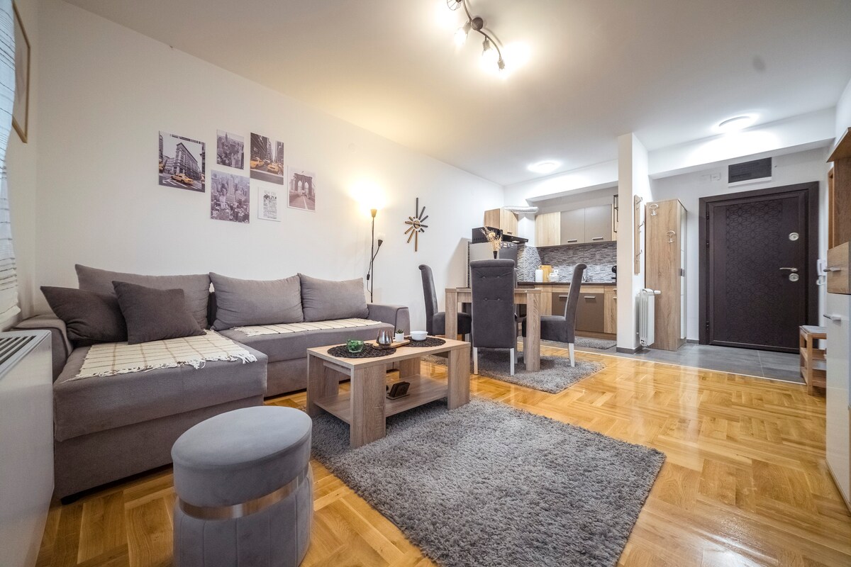 Виняткова квартира в центрі міста. Квартира орієнтована з трьома окремими кімнатами та двома терасами. З однієї тераси відкривається вид на Червону площу, а з другої тераси відкривається вид на прекрасну церкву Пазар. Будівля має два входи. Один вхід веде саме до Червоної площі та піщаної зони, а інший - до входу з паркінгу. Квартира обладнана новими меблями та побутовою технікою і є справжнім задоволенням для перебування там.