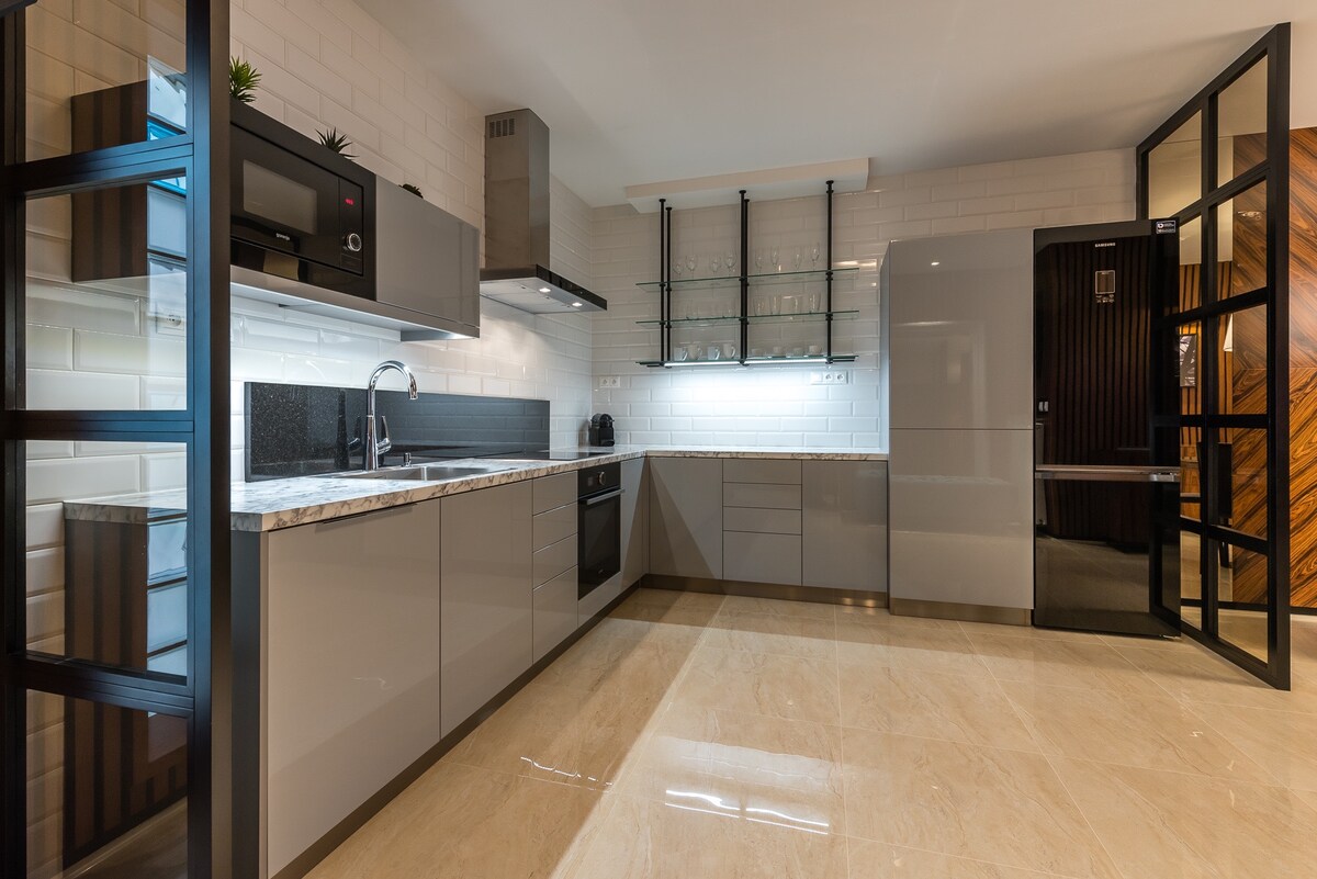 Розкішне, сучасне житло в модній 3-кімнатній квартирі, розташованій в центрі міста. Магазини, ресторани та автобусні зупинки знаходяться в межах 100 метрів від помешкання. Нещодавно відремонтована квартира обладнана високоякісними меблями та технікою, вбудованими стельовими динаміками, аудіосистемою 5.1, 55-дюймовим 4K-телевізором Smart TV, смарт-телевізором у спальні, величезним душем та багатьма іншими зручностями. Дизайн справді унікальний, і ви ніде більше не побачите.