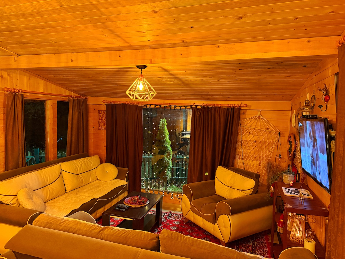 У цьому зрубі для відпочинку є комфортне місце, камін і джакузі. Квартира з окремим входом складається з 1 вітальні, 1 спальні та 1 ванної кімнати з душем та біде. У квартирі також є барбекю. Апартаменти з терасою з видом на сад також мають звуконепроникні стіни та телевізор із плоским екраном і послугами потокового передавання. У зрубі є 2 ліжка та 2 дивани у вітальні.