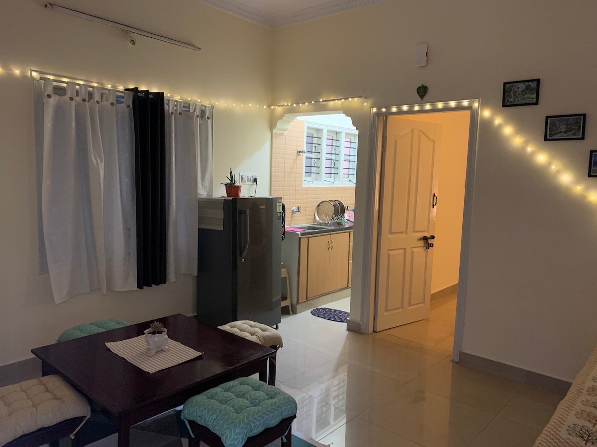 Welcome, Gloss over the stay details Type of stay ( ENTIRE 1 BHK) - 1 BHK Apartment with living room, kitchen, bedroom with attached bathroom. Amenities - king size bed - comfortable Sleepwell mattress - Essentials ( Towels, soaps, Handwash, toilet paper, extra blankets) - Air Conditioner - Flat-screen TV - Wifi (Internet) - Sofa & Table - Refrigerator - Basic kitchen amenities ( refer kitchen photos to know more about kitchen utensils provided ) - Hot water (Geyser) - Daily Housekeeping