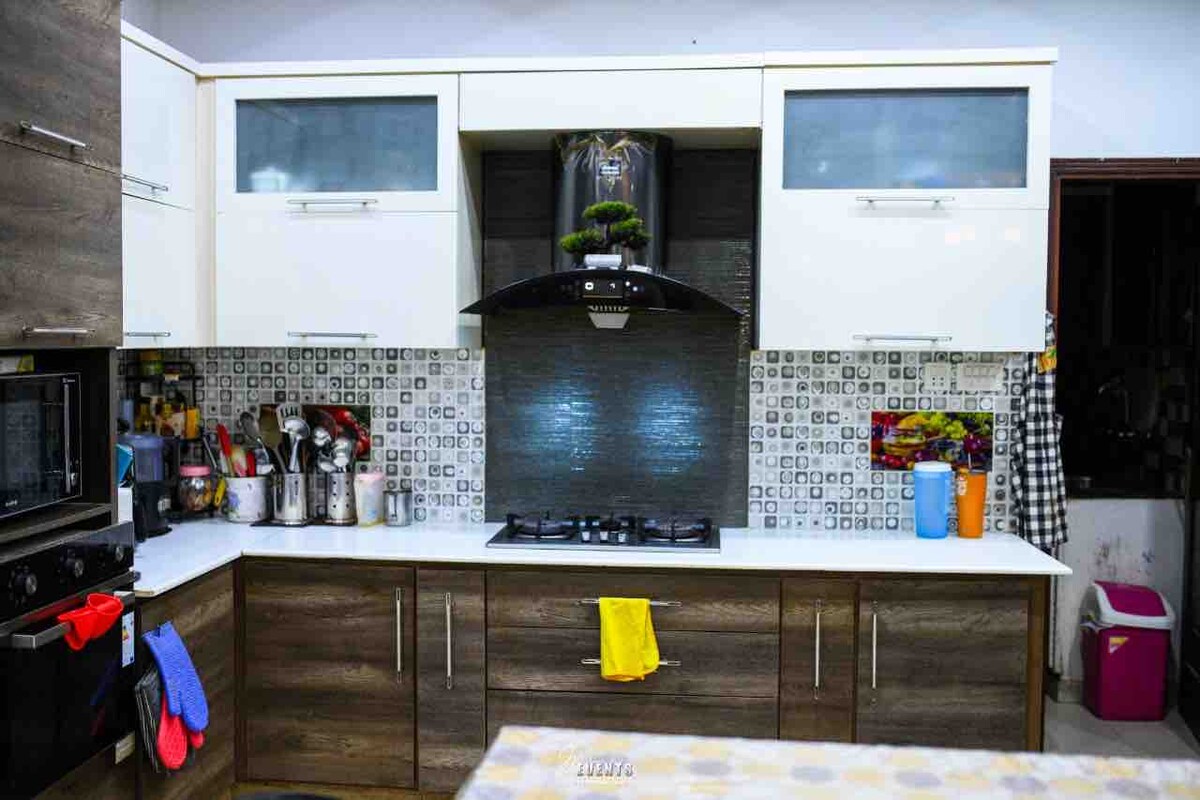 Зручний приватний будинок з 1 спальнею, приєднаною ванною кімнатою, затишними диванами та обідньою зоною. Розташований на проспекті Кадір біля об’їзної дороги навколо юридичного коледжу Еверест, поруч із рестораном Saima Downtown і рестораном Kababjees. Пропонує паркування, спокійне оточення та легкий доступ до головних доріг, ресторанів і повсякденних потреб – ідеально підходить для пар, сімей або бізнес-мандрівників.