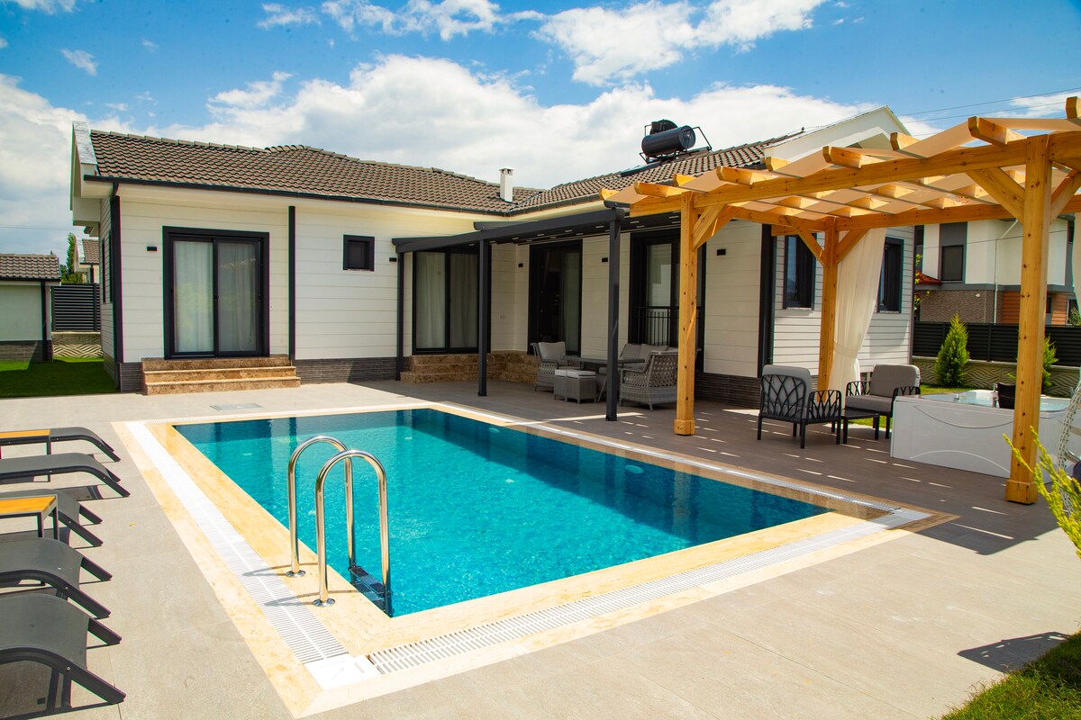 Ви можете відпочити всією сім 'єю в цьому спокійному помешканні. Наша вілла повністю укомплектована дерев' яним дизайном, який повністю спроектований дерев 'яною підлогою. Кімнати та ванні кімнати дуже широко оформлені. Розташоване в місці на природі, приблизно в 8 км від моря, в районі Гекцеовацик, пов 'язаному з містом Гочек. Басейн 8×4x1,5. У кожній кімнаті є окремий телевізор та кондиціонер, а біля басейну є зона з телевізором. Сад досить великий. Найкраще рішення для свята