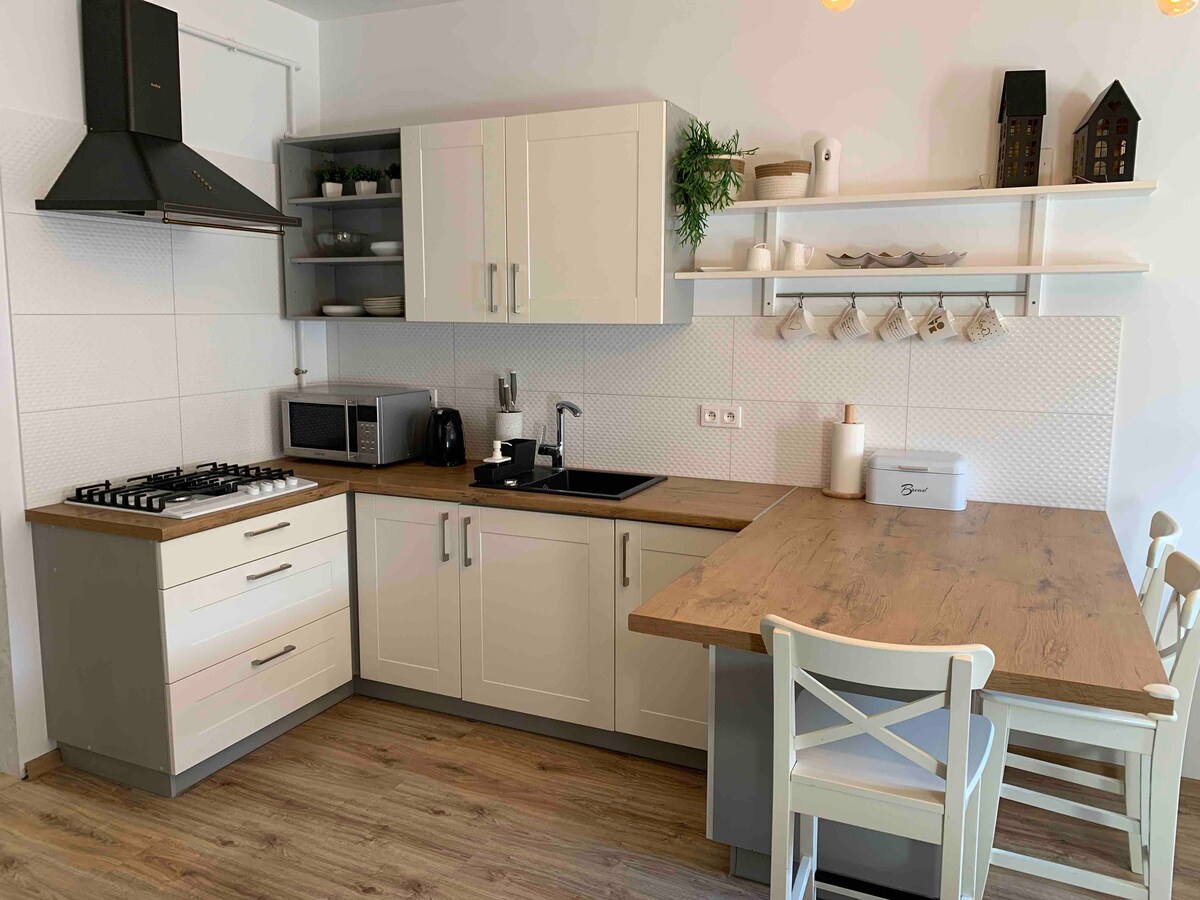 Стильне місце для розміщення в самому центрі Кротошина. 5 хвилин від ринку і 2 хвилини від парку також 2 хвилини від продуктового магазину. У квартирі є дві кімнати (спальня та телевізійна кімната з диваном-ліжком зі свіжою білизною). У спальні є ліжко, а в кімнаті з телевізором - диван-ліжко/диван. Є телевізор і доступ до Wi-Fi. Є одна ванна кімната з душем. Кухня обладнана.