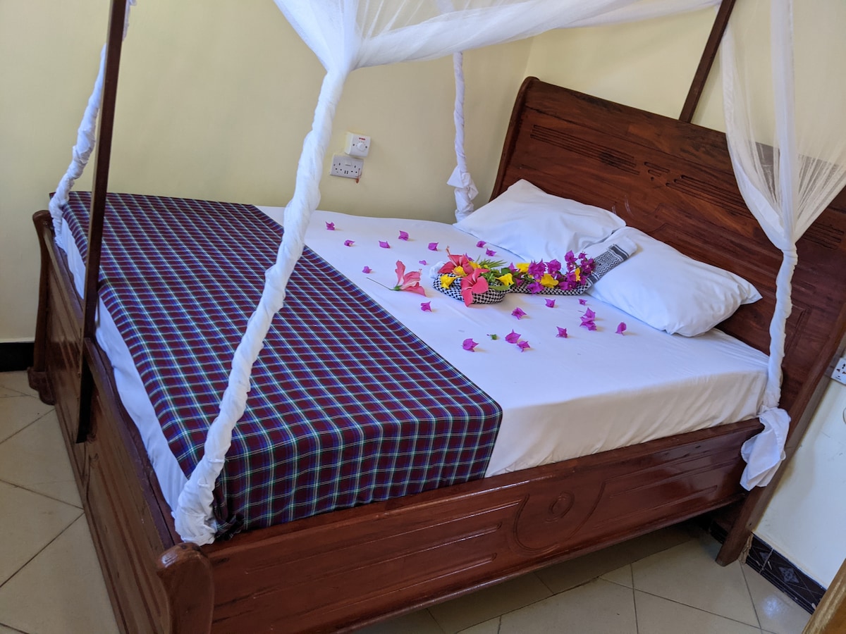 Затишне велике двоспальне ліжко, заміський будиночок з однією ванною, розташований в Утенде, всього в декількох кроках від найстарішої та найбільшої морської заповідної зони Танзанії. Добре облаштований будинок далеко від дому - у котеджі є повністю обладнана кухня, душ з гарячою водою, лаунж-зона та обідня зона в саду Для тих, хто не хоче готувати, ми організовуємо за запитом приватного кухаря подавати смачні страви, орієнтовані на свіжі продукти та морепродукти у вашому саду. Меню з 3 страв - 12 доларів