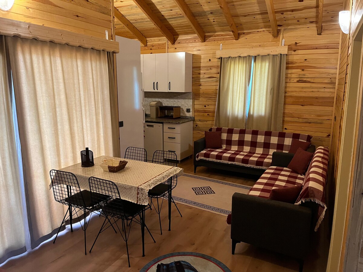 Cozy two-story wooden house on the Lycian Way in the quiet seaside village of Karaöz. Upstairs has a bedroom with a double bed, private bathroom, and a balcony with sea view. Downstairs features an open-plan kitchen, a living room with a sofa bed, and a second bathroom. The garden has a natural soil ground and space for parking. Surrounded by nature and close to the sea, it's perfect for couples or small families seeking peace and relaxation.