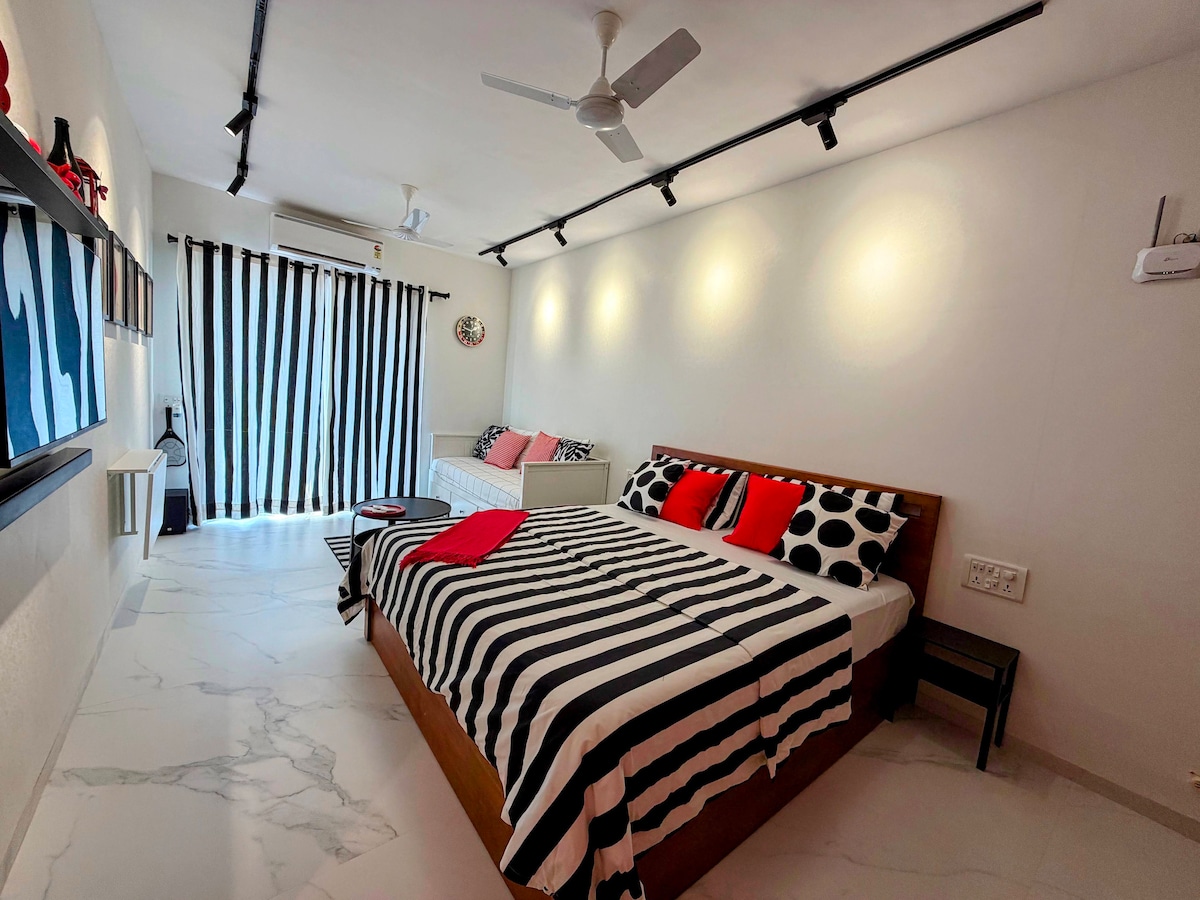 Розкішна студія в стилі бохо з джакузі та садом. Спокійний відпочинок. Повністю завантажений Wi-Fi, домашній кінотеатр JBL 2.1, музична система BT, LED-телевізор Full-HD. Стильна ванна кімната з туалетним приладдям. Комора з засобами для приготування чаю/кави, водою RO, мікрохвильовою піччю, індукційною варильною поверхнею, холодильником та тостером. Огороджений сад для дітей. Пообідайте в саду з прекрасною погодою. У джакузі є гаряча вода, якою можна користуватися в будь-який час. Загальні зручності на території, як-от басейн, ігрова кімната, тренажерний зал, міні-театр, велосипедні прогулянки та ресторан.