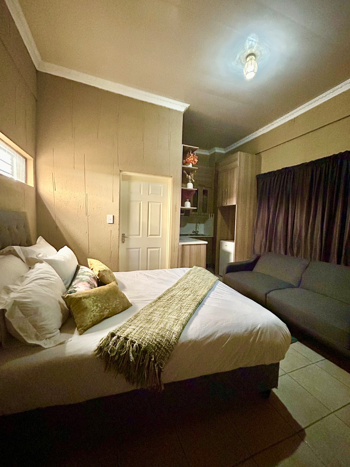 Приватна розкішна квартира, прикріплена до нашого помешкання. Вона обладнана ліжком queen-size, міні-кухнею та кондиціонером. На міні-кухні є повний набір посуду, столових приборів, чайник, тостер, індукційна плита, мікрохвильова піч, фритюрниця та прихований барний холодильник. У ванній кімнаті є величезний душ, схожий на спа, і м 'який туалет. Безкоштовний Wi-Fi та безкоштовний доступ до Netflix, Prime Video та Showmax. Гості можуть увійти в власний акаунт DSTV.