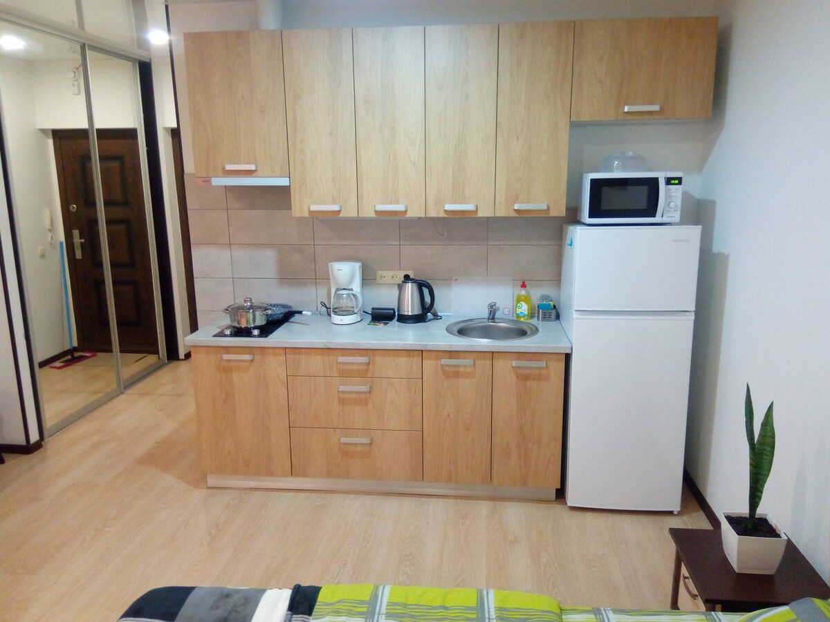 Невелика затишна квартира для одного або двох гостей дозволить відпочити з комфортом від суєти міста і забути про проблеми. 5 хвилин від вокзалу або метро Вокзальна, і ви на м'якому дивані з пультом в руках дивитеся на великому смарт-телевізорі улюблений фільм або футбольний матч. Кухня, обладнана всією необхідною технікою та посудом, дозволить швидко приготувати їжу. Гаряча ванна принесе максимум задоволення. Близькість супермаркетів, магазинів та салонів задовольнить усі ваші бажання та потреби.