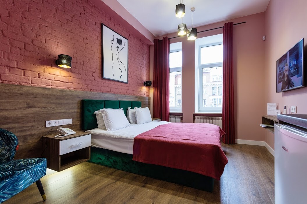 Затишна квартира готельного номерного типу (19 кв.м) в культурно-діловій та історичній частині Києва. Велика Васильківська вважається однією з розкішних вулиць в самому центрі міста, в декількох хвилинах ходьби від розважального центру «Арена Сіті», «Мандарин Плаза», Бессарабської площі, вулиць Хрещатик і Басейна. На 1-му поверсі в цьому будинку знаходяться «Італійська редакція», «ТАКАВА» та «Мушля кафе». Номер без балкону, але з чудовим видом.