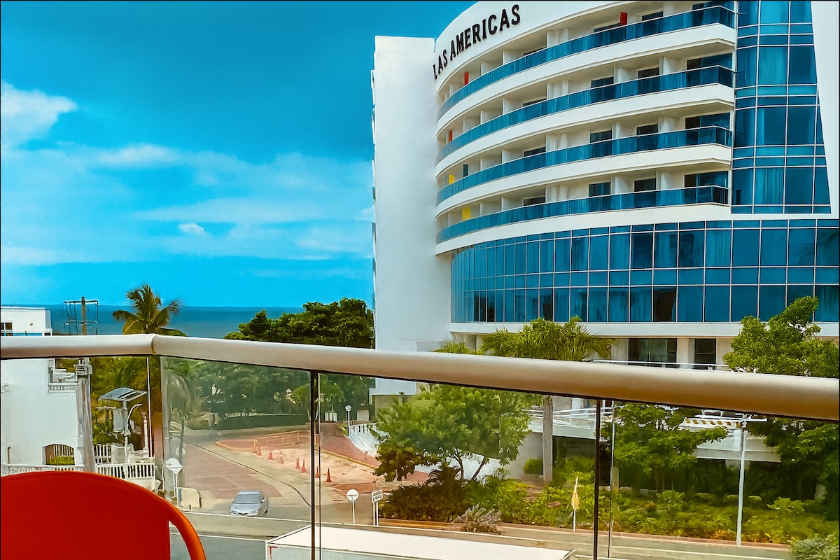 Квартира з видом на океан, балконом і джакузі на даху. Зручно розміщує до 6 гостей, ідеально підходить для сімей, друзів або ділових поїздок. До послуг гостей повністю обладнана кухня, телевізор Smart TV, Wi-Fi, кондиціонер, гаряча вода, пральна та сушильна машини та приватне паркування. Розташована в одному кварталі від пляжу Моррос і поруч із конференц-центром Лас-Америкас, за 5 хвилин від аеропорту та за 10 хвилин від Старого міста. Зручності будівлі включають тренажерний зал і терасу на даху з 2 джакузі з видом на Карибське море.