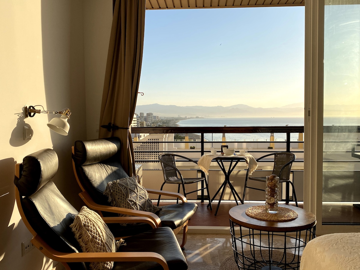 Цей лофт має чудовий вид на море та гори, і він зі смаком мебльований. Один простір, який дозволить вам милуватися морем з усіх куточків. Розташоване в тихому зеленому житловому районі з красивими садами та басейном. Ви можете насолоджуватися комфортом і зручністю власної величезної тераси, ідеального місця для відпочинку! Вниз по пагорбу (досить крутому) ви дістанетеся до пляжу Ла-Каріуела з безліччю ресторанів і магазинів. Залізничний вокзал знаходиться на відстані короткої прогулянки через дорогу.