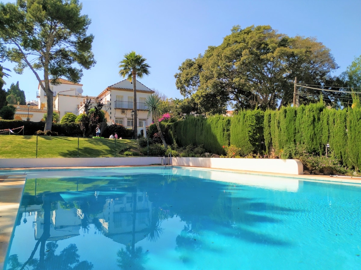Простора 1BD з великою терасою. Використання басейну (сезонне відкриття), тенісного корту, садів та прямого доступу до пляжу. Air con / heat, смарт-телевізор, музичний динамік з синім зубом та оптоволоконний WI-FI. 5 хвилин ходьби від центру Торремоліноса та залізничної станції до аеропорту Малаги.