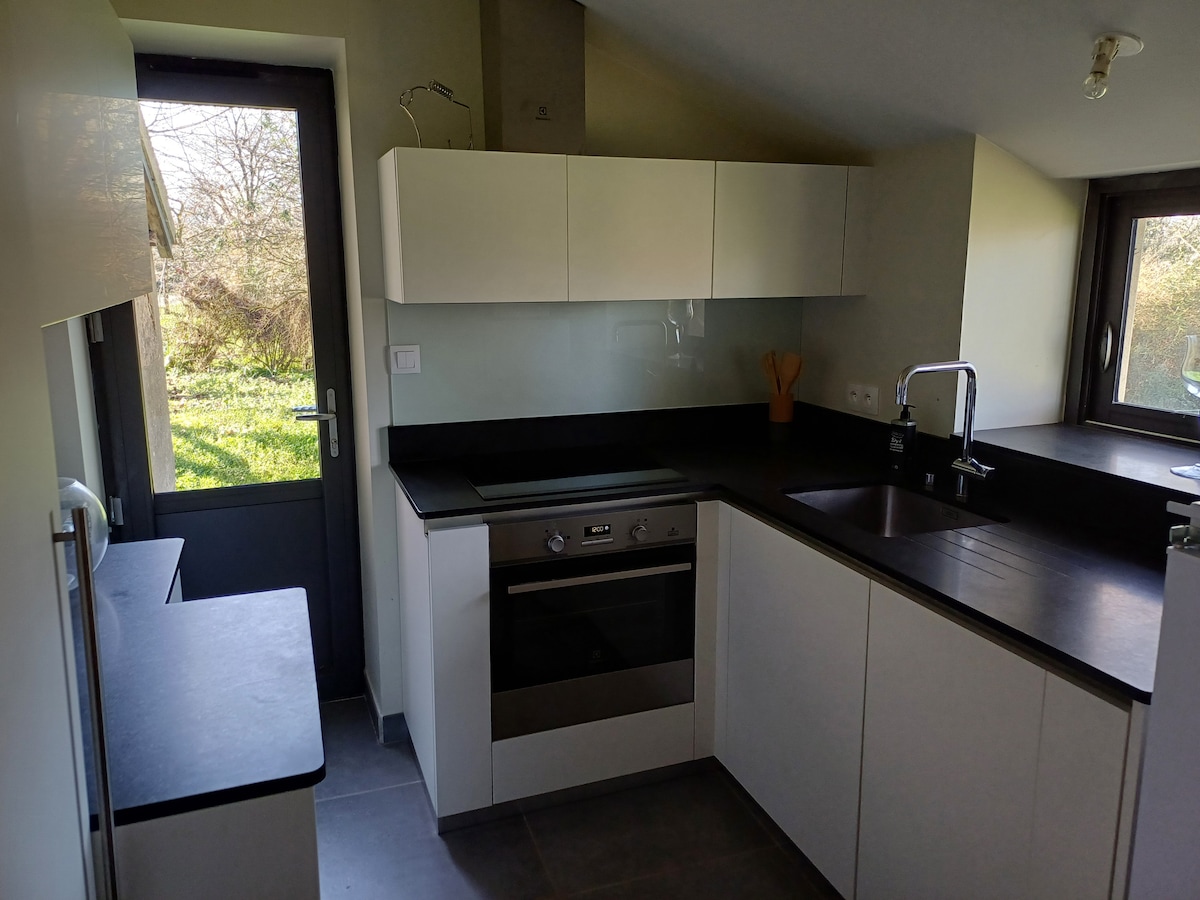 Відпочиньте в цьому прекрасному сараї, перетвореному на лофт. Унікальне тихе помешкання, за 2 кроки від шосе та Монлюсона. На першому поверсі: - 1 вітальня площею 45 кв. м - 1 обладнана кухня (+ мікрохвильова піч, кавоварка Senseo) - 1 ванна кімната Нагорі: - 1 велика відкрита спальня 28 м² з 2 ліжками - 1 невелика затишна спальня під дахом з 1 ліжком Немає телевізора Варіанти сніданку (за 5 євро з людини) Безпечна парковка, закрита територія. Більше інформації про lagrangedemarie