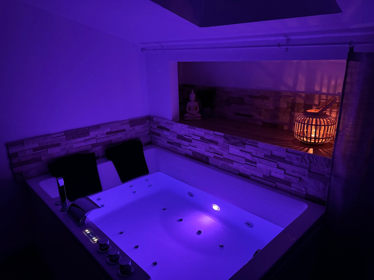 maisonnette 2 pièces de 40m2 idéal pour 2 personnes mais pouvant accueillir un bébé. Séjour salle à manger TV connectée avec netflix disney + prime vidéo et apple tv+ fourni en bas.WIFI, cuisine équipée salle de bain. A l'étage une chambre double avec jacuzzi, éclairage personnalisable + écran 55" QLED avec Apple TV pour profiter tout en se relaxant !! Parking 1 voiture ou motos (WELCOME BIKERS🔥) ⚠️ PRESTATIONS OPTIONNELLES SUSPENDUES POUR LE MOMENT⚠️