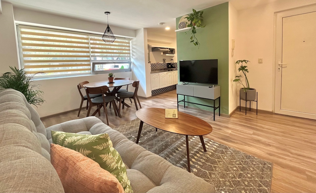Світла квартира на 7-му поверсі (верхній поверх) з балконом і видом на місто та Ріо-Бесерра-Віадукто-Мігель-Алеман. Вона має 2 спальні з просторими шафами, вітальню та їдальню, обладнану кухню, ванну кімнату та вікна від підлоги до стелі. Смарт-телевізори (50" і 24") з Netflix, Prime і YouTube (гості входять у свої власні облікові записи). У вартість входить Alexa, холодильник, мікрохвильова піч і кавоварка. До будівлі можна дійти пішки, приблизно 10 сходинок. Ідеально підходить для комфортного перебування з хорошим сполученням.