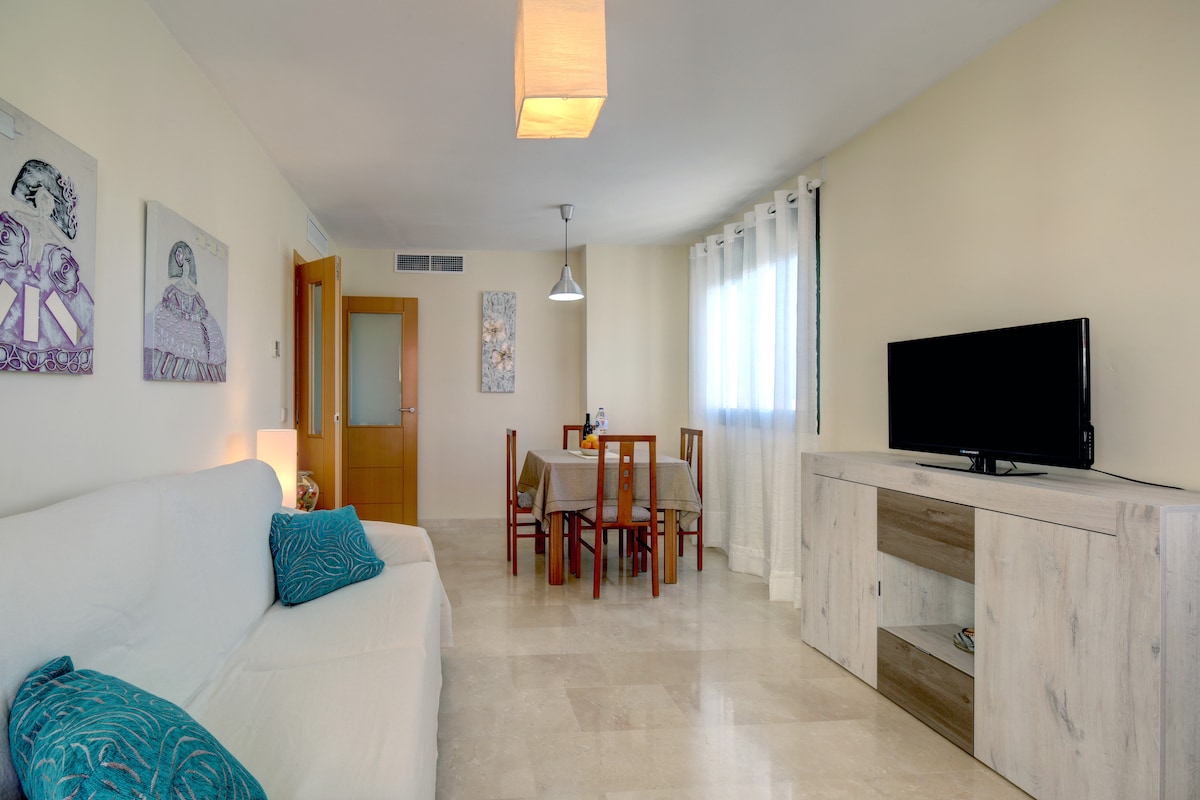 Сонячна квартира, щоб розслабитися, насолодитися і розважитися. Квартира розташована в закритому комплексі з видом на море. У чудовому саду є два басейни і дитячий басейн, а також ігровий майданчик. Квартира ідеально підходить для сім 'ї. Вона має комбіновану вітальню/їдальню, кухню, 2 спальні та 2 ванні кімнати. Один з них En Suit. Він повністю оснащений WiFi, пральною машиною, посудомийною машиною тощо. Ви почуватиметеся як вдома.