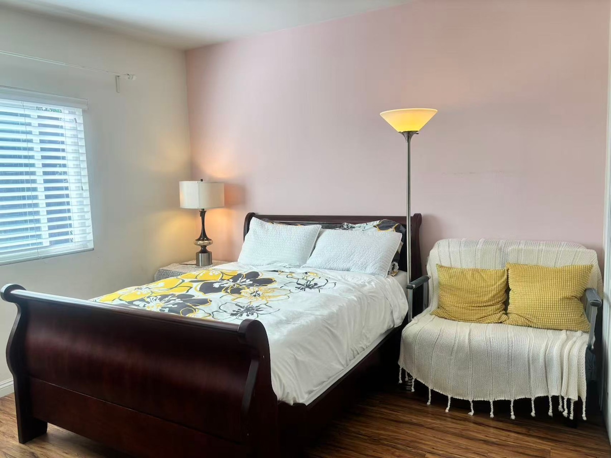 Quiet and cozy standalone guesthouse with private entrance and self check-in. No contact with other guests, no spaces are shared — everything is entirely for your private use. Features a queen-size bed ideal for couples, an additional sofa bed can be provided for the third guest to sleep on. A/C and heating, work desk, fan, and smoke detector. Enjoy a private kitchen for light cooking, a walk-in shower, and blackout curtains for restful sleep. Large windows provide plenty of natural light.