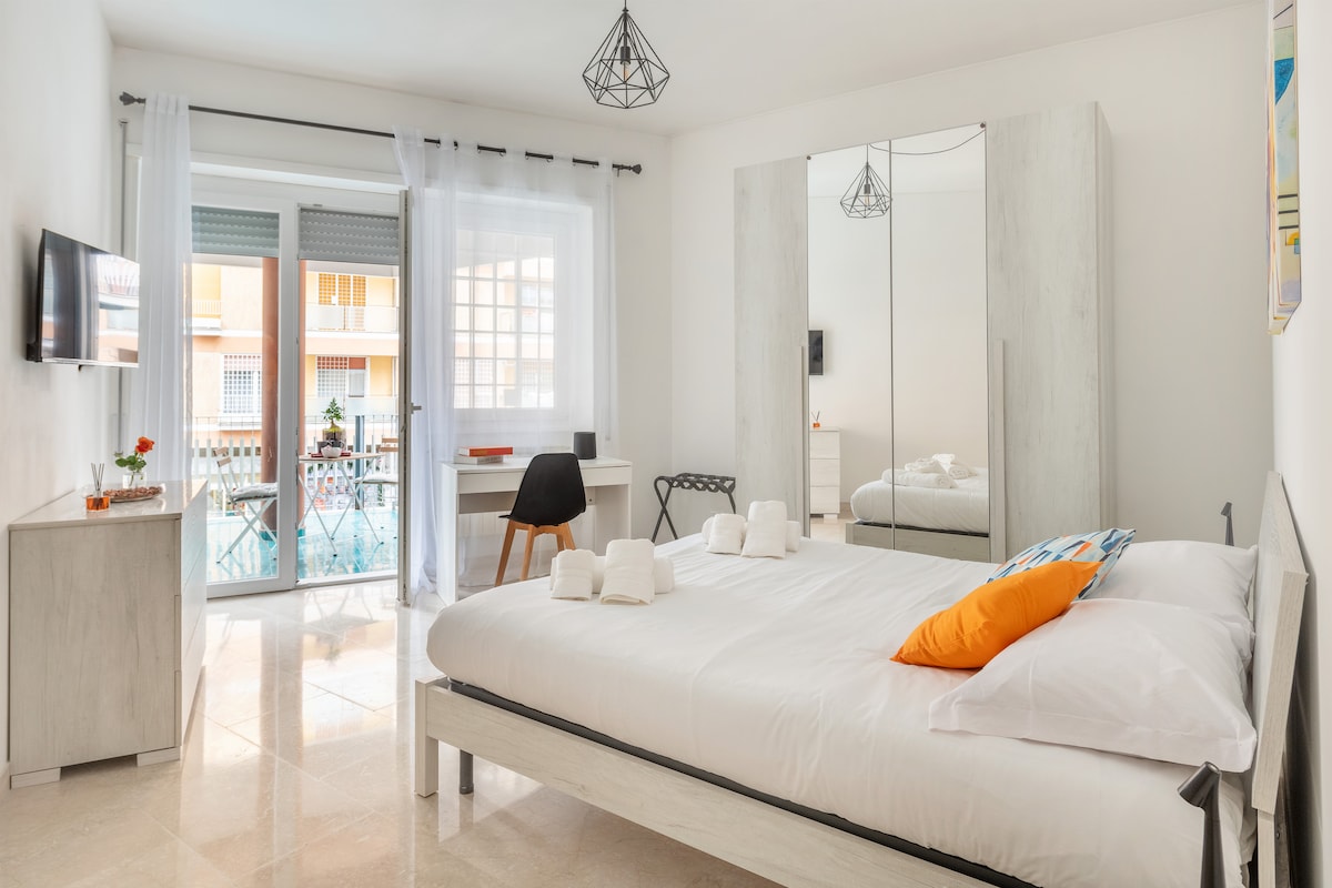 Дизайнерська квартира з великим балконом, з якого можна насолоджуватися прекрасним видом на 180°, який охоплює як міський контекст, так і зелень району Пізана. - У помешканні є просторий люкс, 1 сучасна ванна кімната з суміжною ванною кімнатою, 1 кухня, обладнана всіма зручностями, 1 чарівна вітальня з двоспальним диваном-ліжком та 1 обладнаний балкон. - Будинок прикрашений вишуканими предметами. - Стратегічне розташування, далеко від смога, оточене зеленню, з 'єднане з центром та аеропортом FCO.
